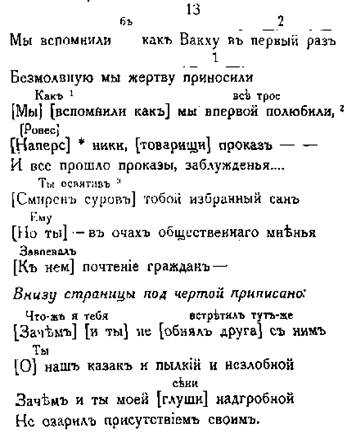 2) зачеркнутое и восстановленное слово сопровождается звездочкой * , помещаемой после слова. Если зачеркнута и восстановлена часть слова, то она заключается в прямые скобки [ ] , после которых ставится звездочка. В случае целого слова скобки могут опускаться. Вообще же звездочка после скобок обозначает, что всё, заключенное в скобках, было зачеркнуто и восстановлено;